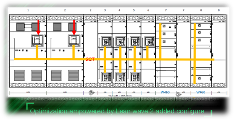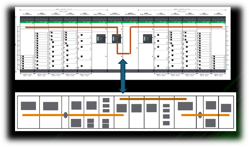 На відміну від класичних схем, силові шини тепер розташовані в центральній частині шафи. Це дозволяє одночасно розподіляти енергію на фідерні лінії як вгору, так і вниз.