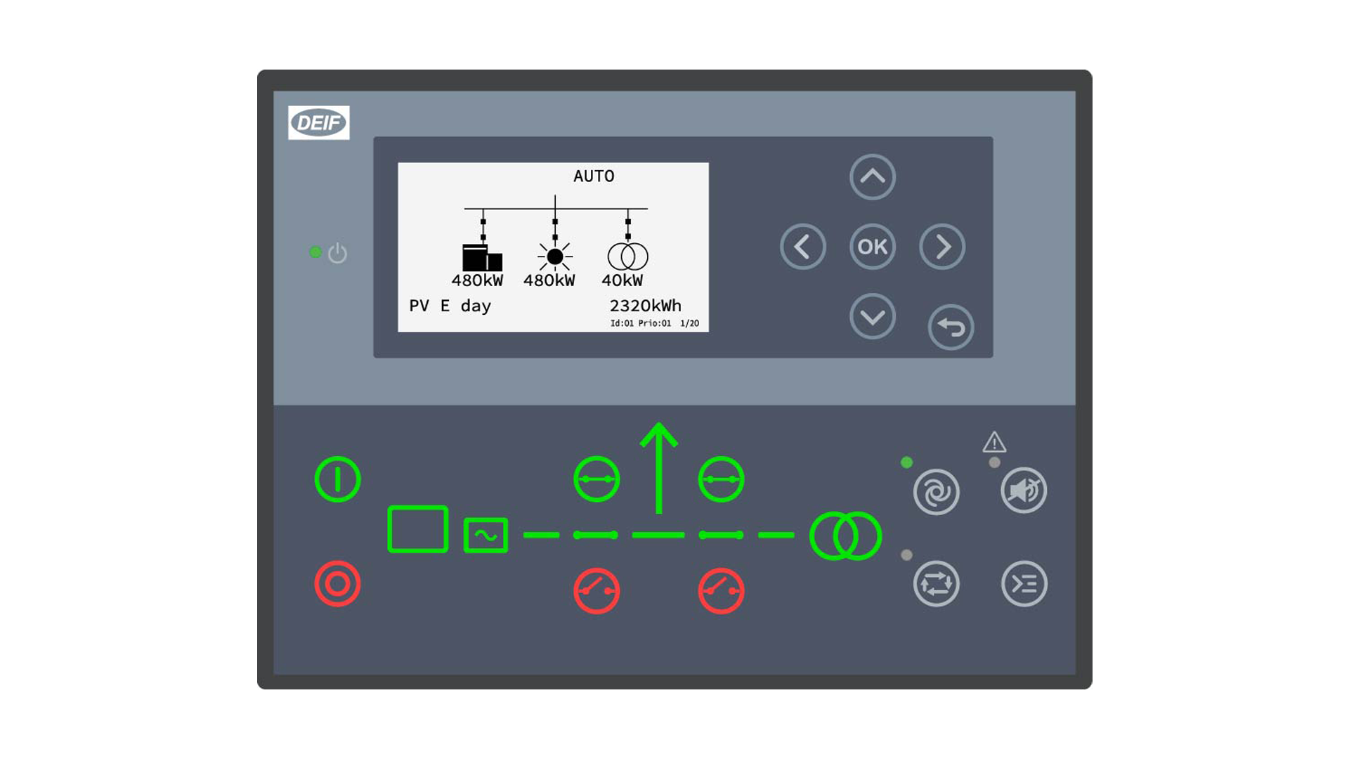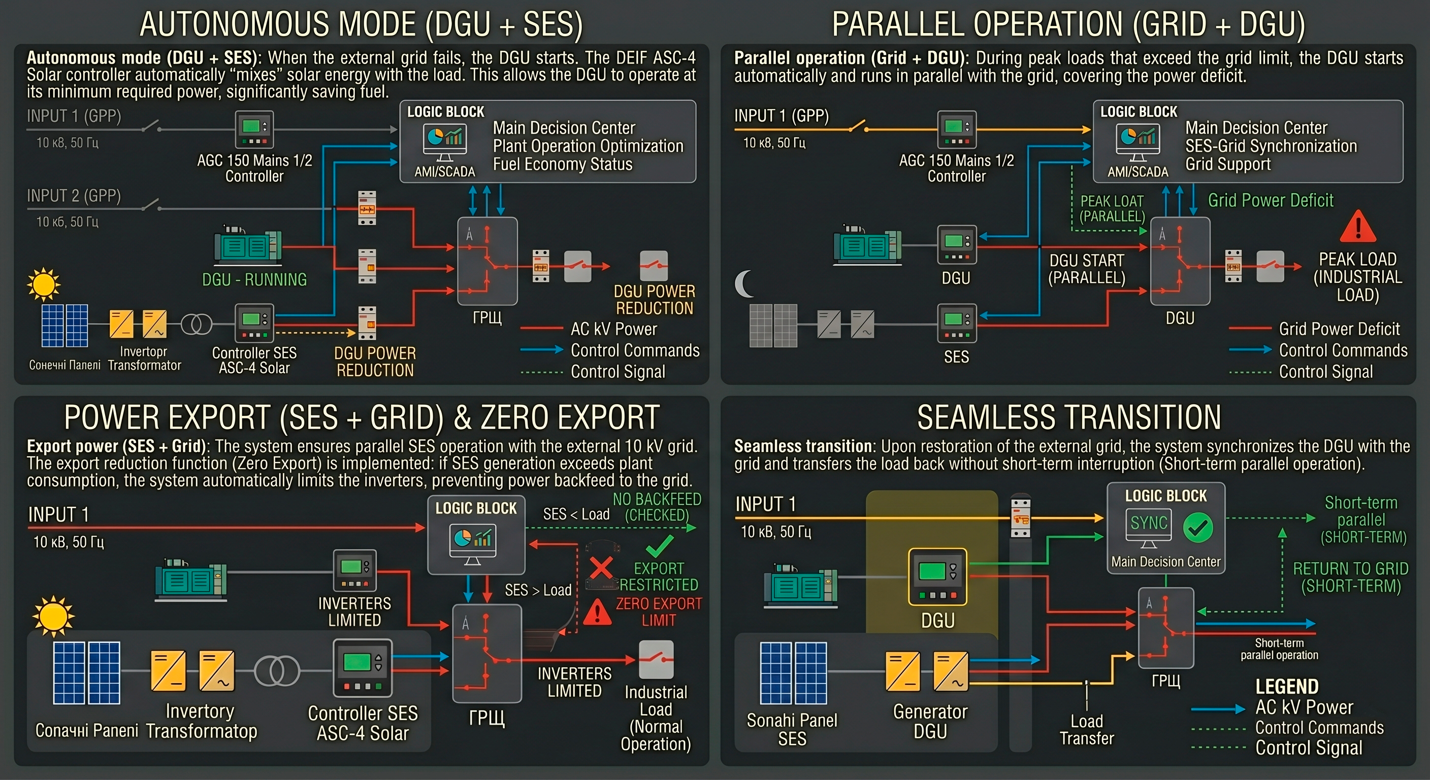 1. Автономный режим (ДГУ + СЭС): При пропадании внешней сети запускается ДГУ. Контроллер DEIF ASC-4 Solar автоматически «подмешивает» энергию от солнечной станции к нагрузке. Это позволяет ДГУ работать на минимально необходимой мощности, значительно экономя топливо.