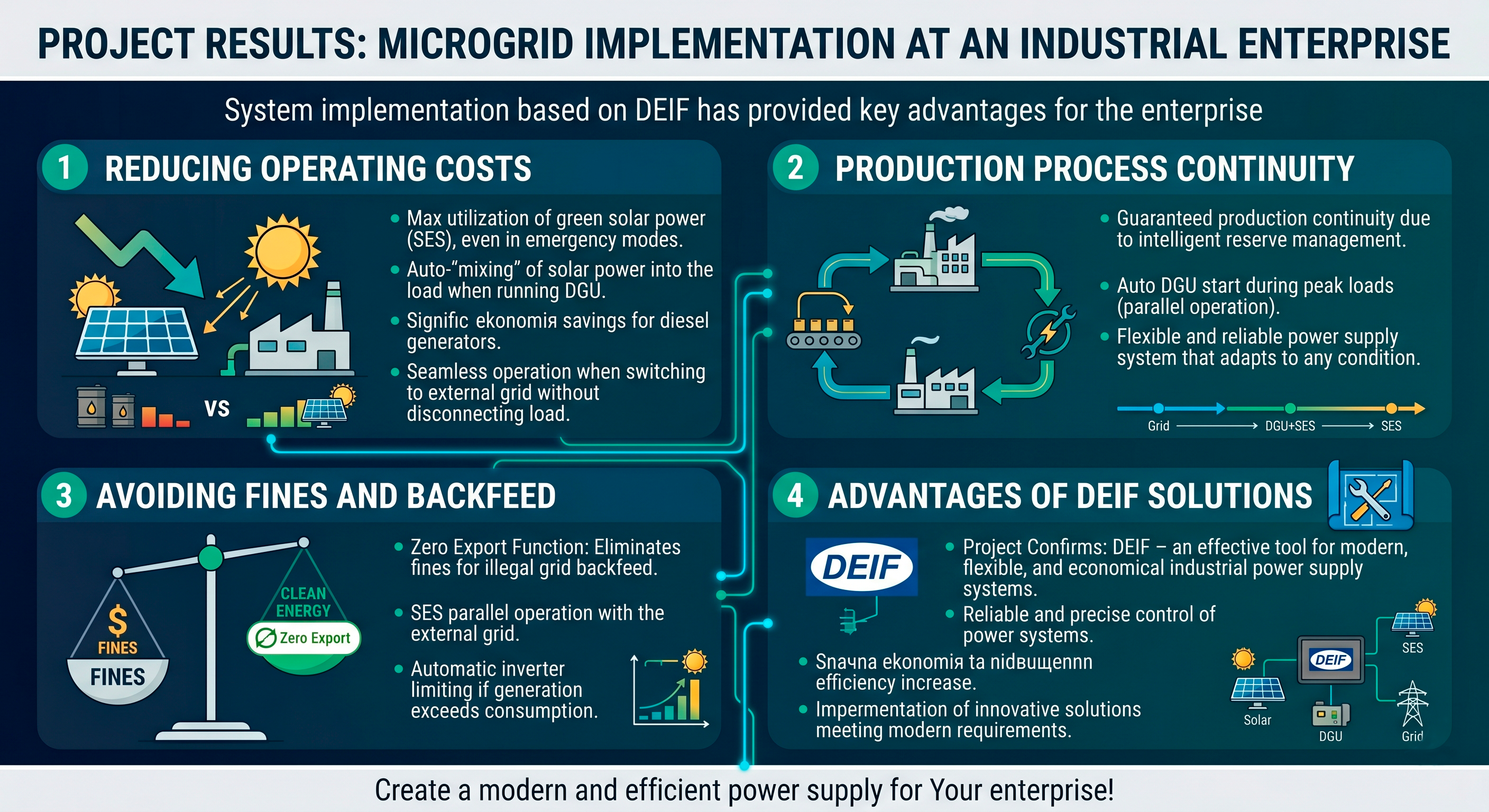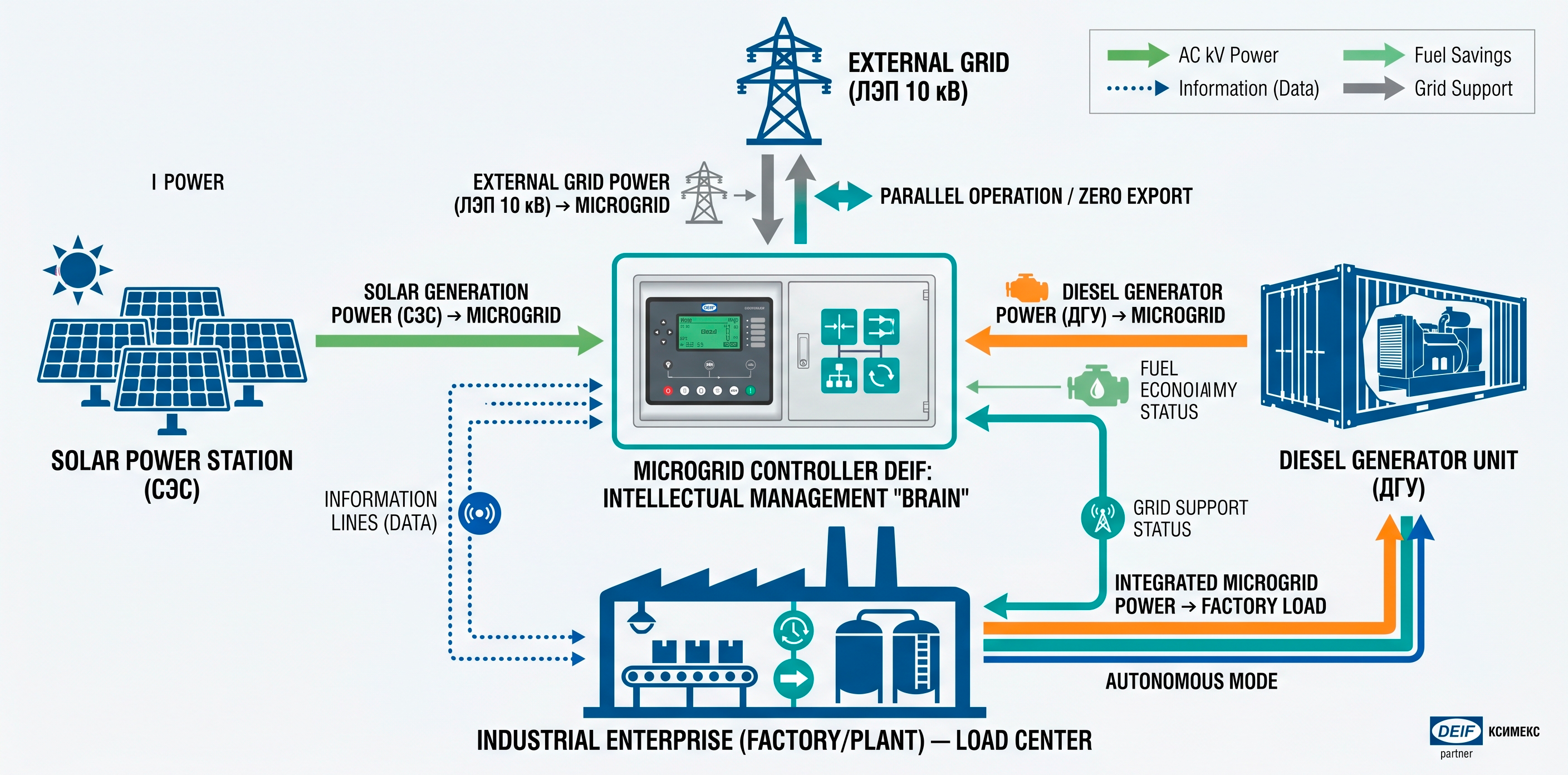 Создать интеллектуальную систему управления (Microgrid), которая объединит все источники (Сеть, ДГУ, СЭС) и обеспечит их совместную параллельную работу в любых комбинациях для максимальной экономии и надежности.